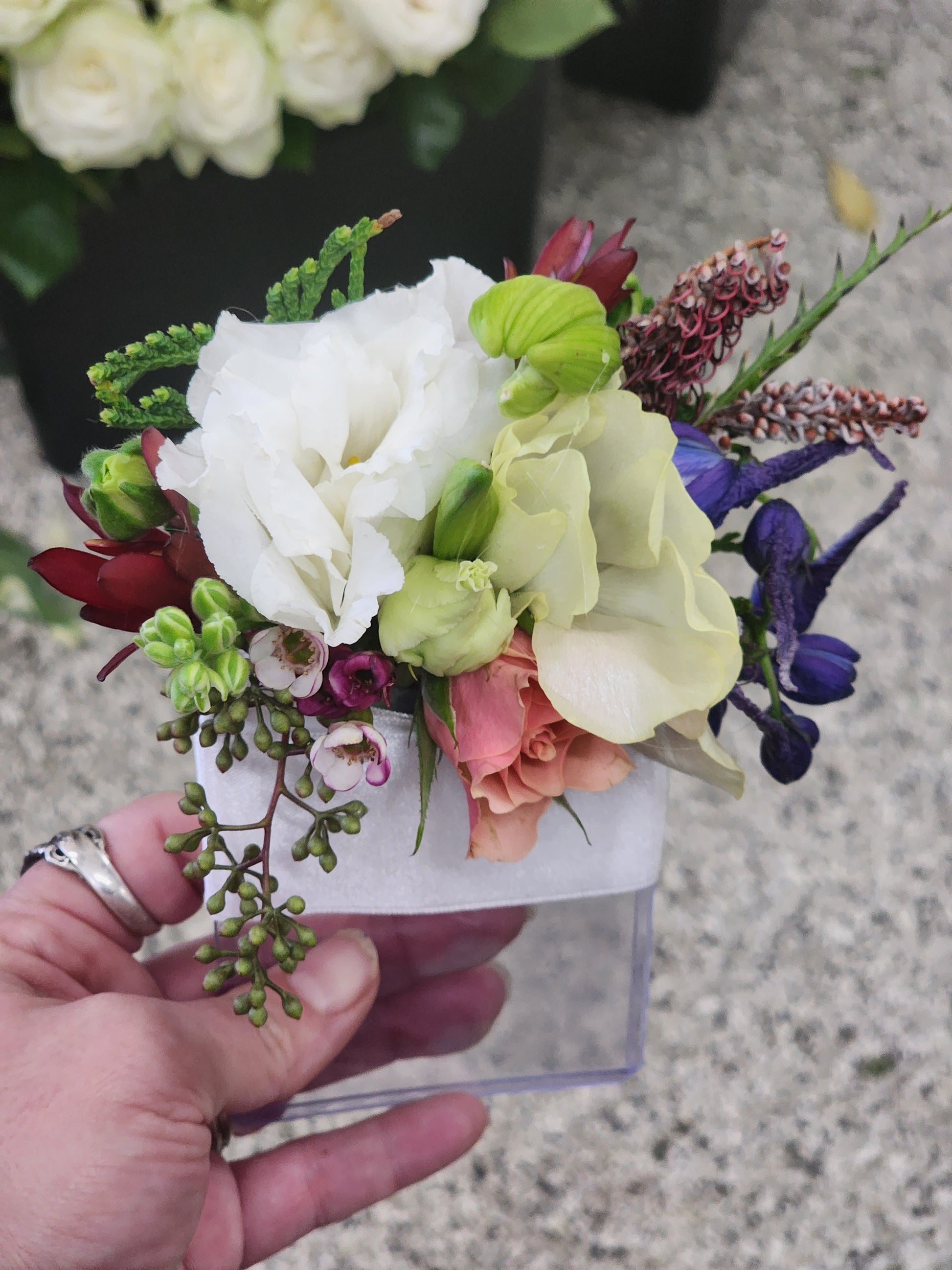 Trending beautiful POCKET Boutonniere for your prom! No pins, just slide into your jacket pocket. Standard boutonniere is 1 white rose and designer's choice of matching greenery.