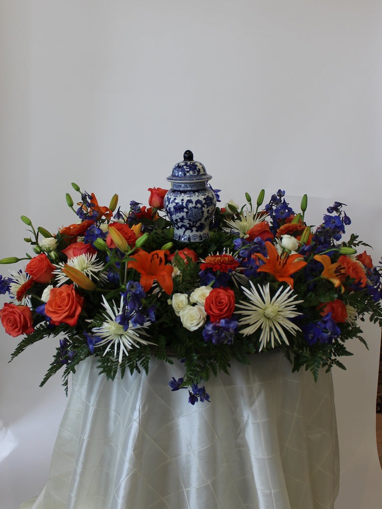 Funeral wreath appropriate for a viewing and or funeral, urn placement in the center of the wreath. Standing wreath or placement of urn in the middle of wreath on a table. Bigger wreath's are available, just call the shop.