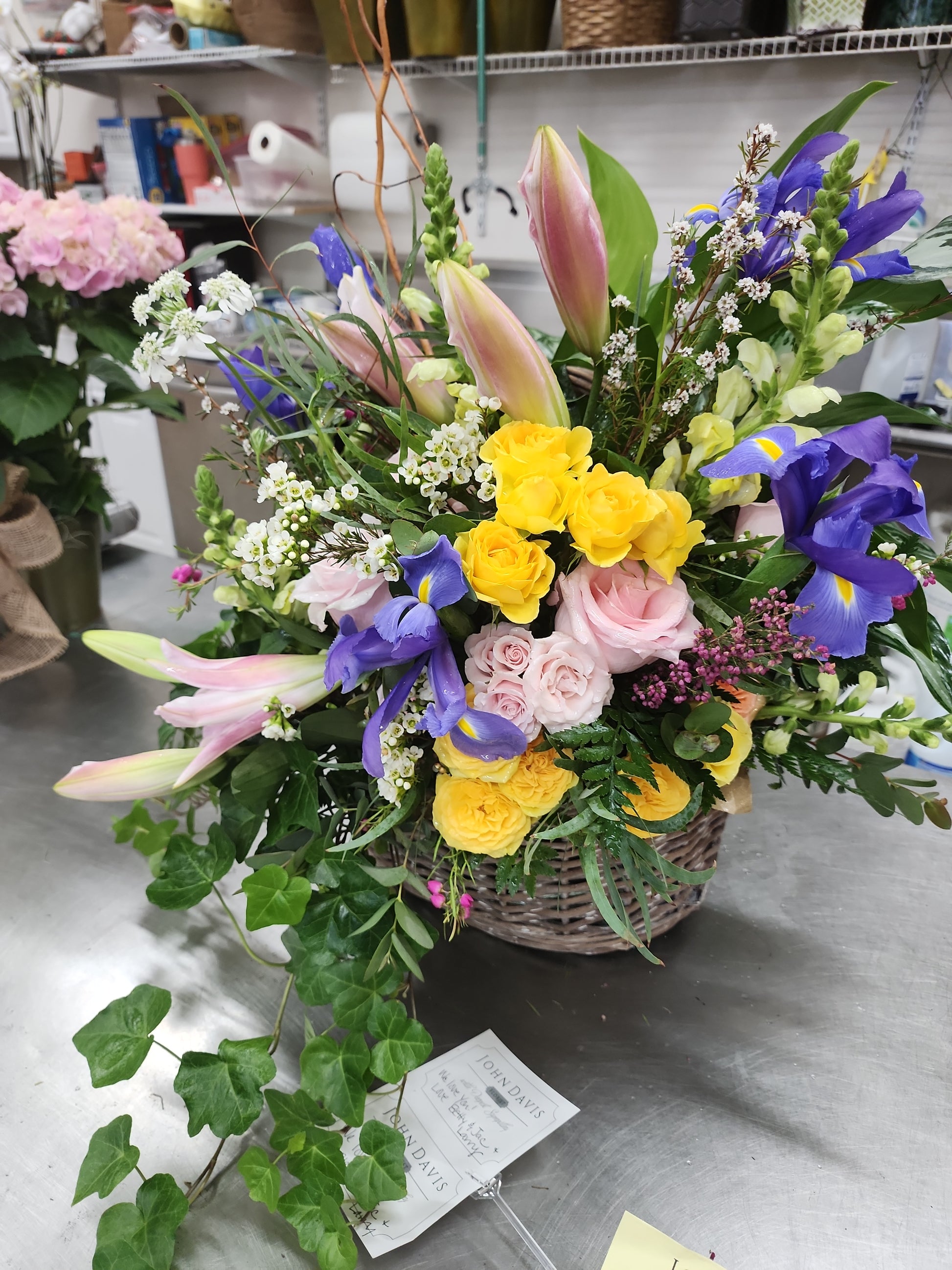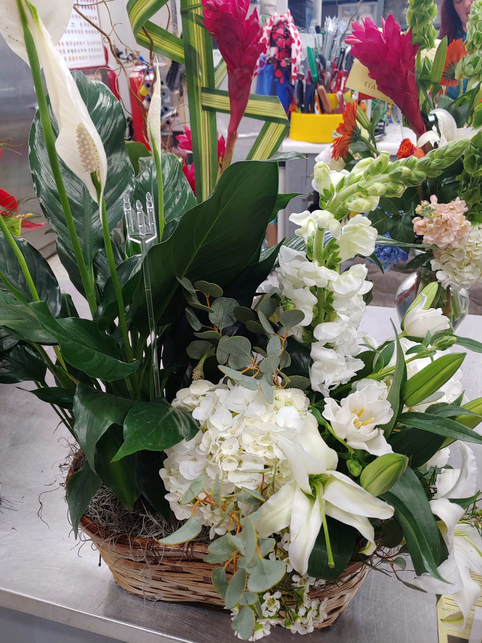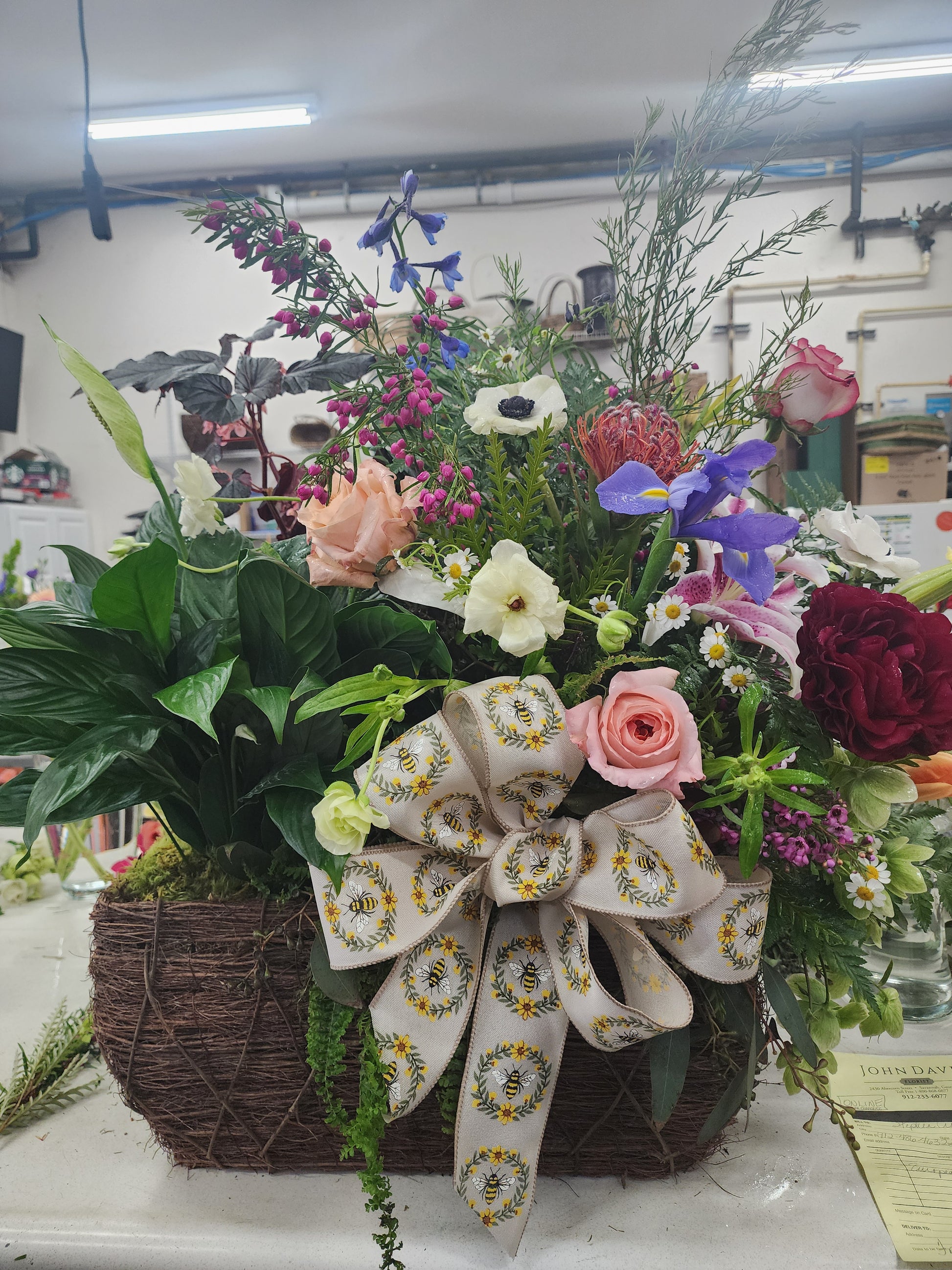 A perfect marriage of a plant with mixed cut flowers arranged in a beautiful basket. Great for saying "I love you" to your favorite gardener or "With Deepest Sympathy" to that special family. Designer's choice.