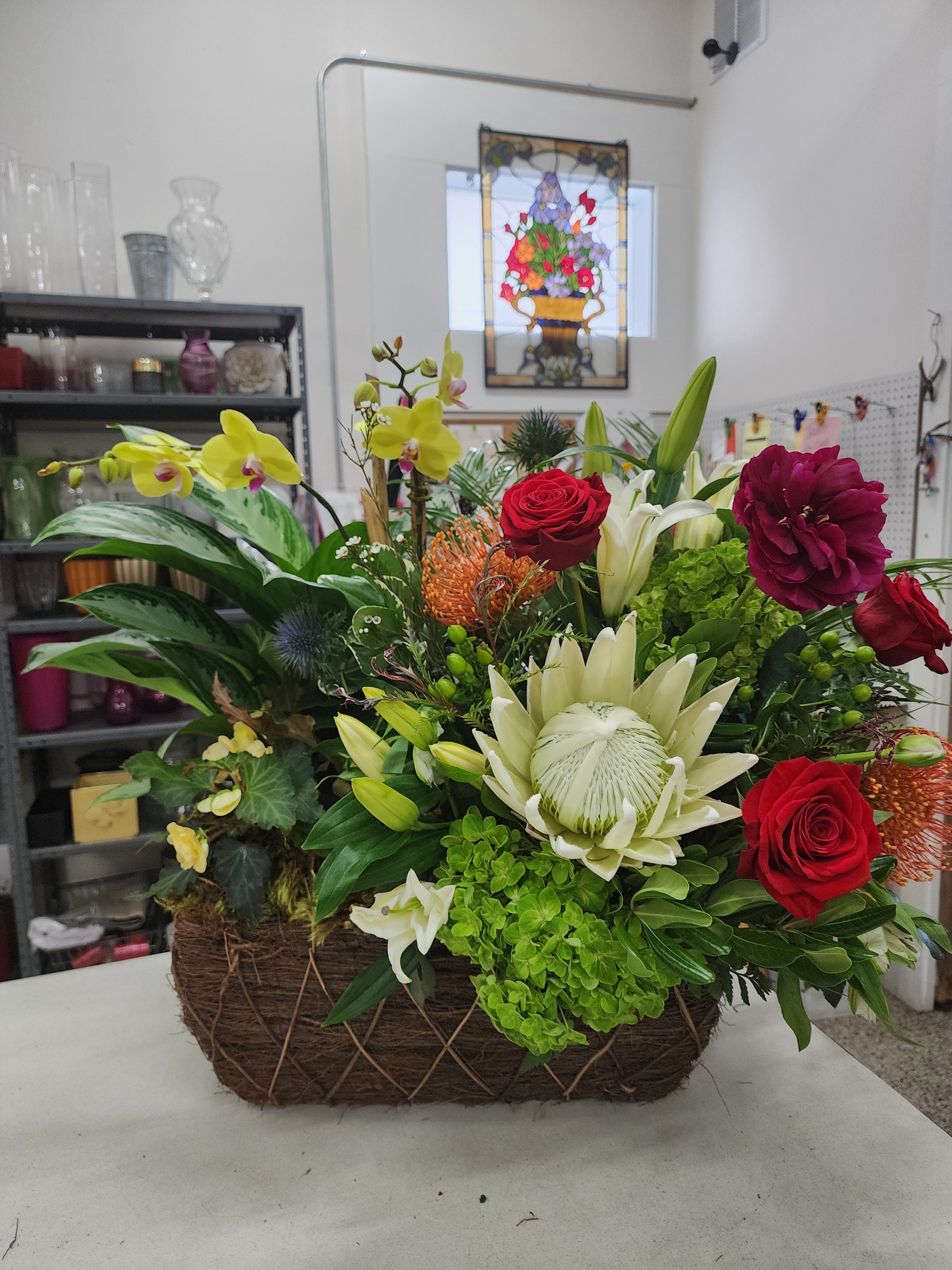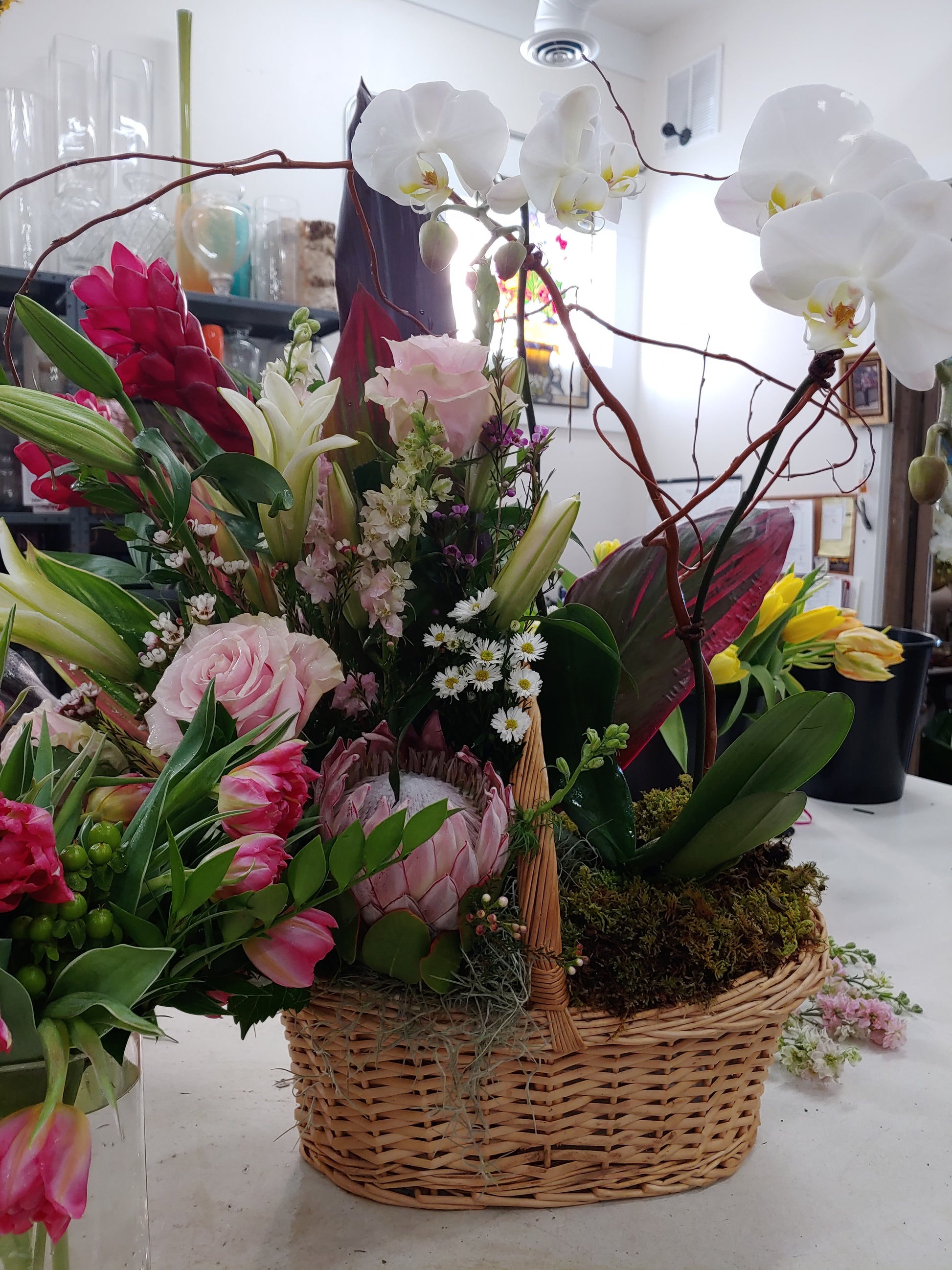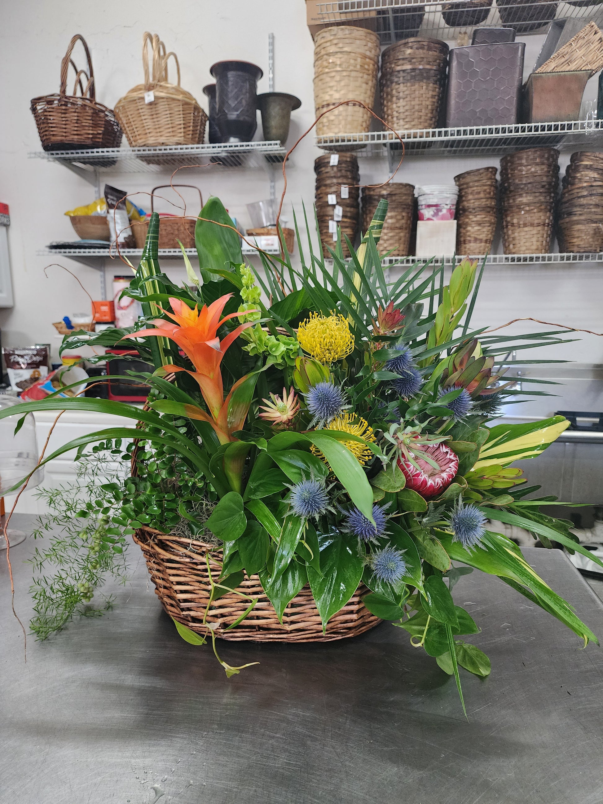 A perfect marriage of a plant with mixed cut flowers arranged in a beautiful basket. Great for saying "I love you" to your favorite gardener or "With Deepest Sympathy" to that special family. Designer's choice.