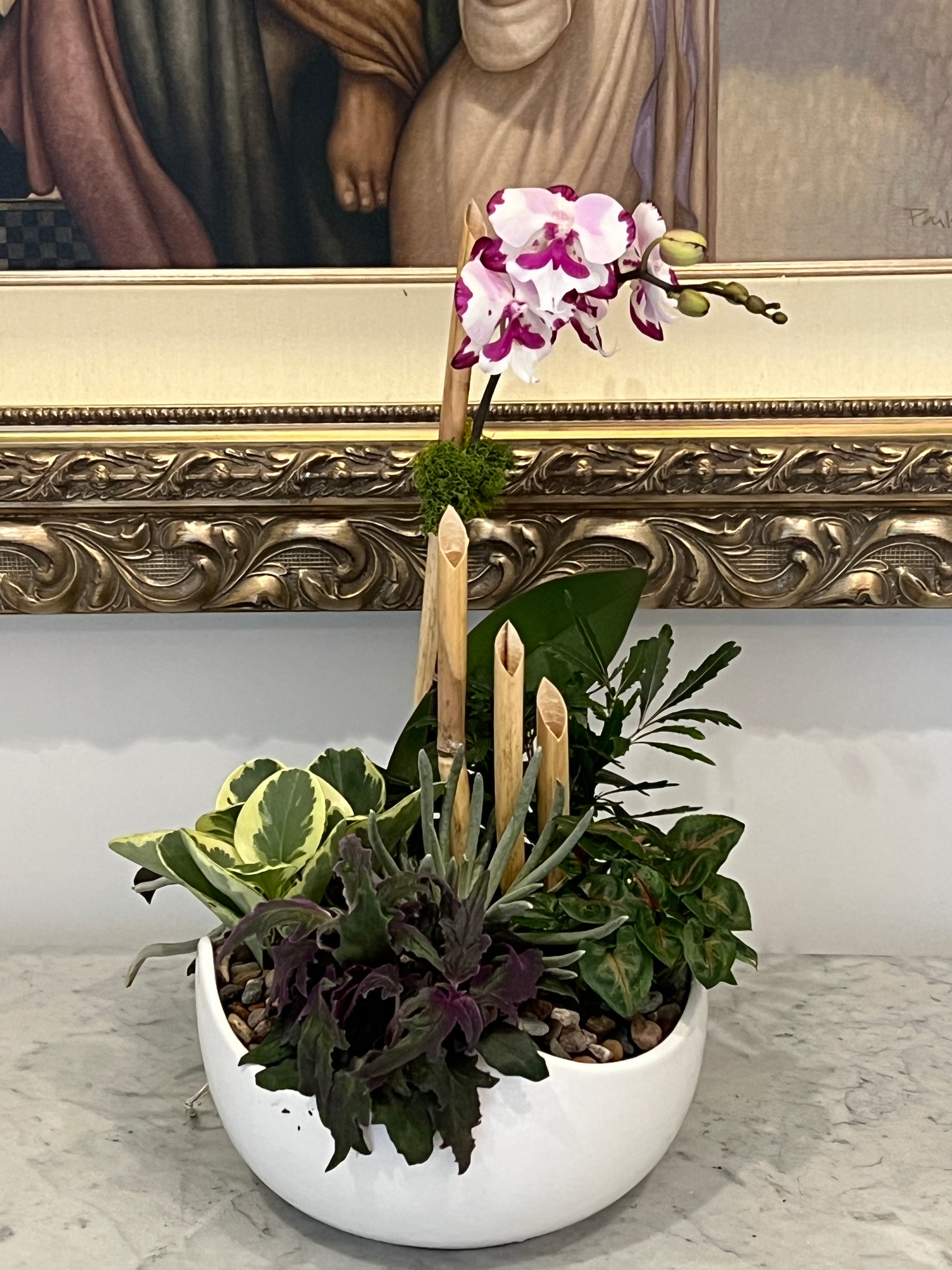 A beautiful vessel with a single, double, or triple orchid Garden. Upgrade options available. Call the shop.